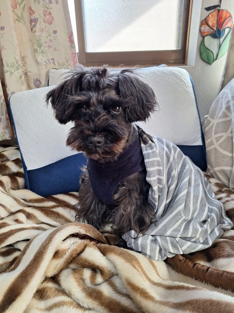 寝起きのボサボサで主の着ていたパジャマをかけたまま