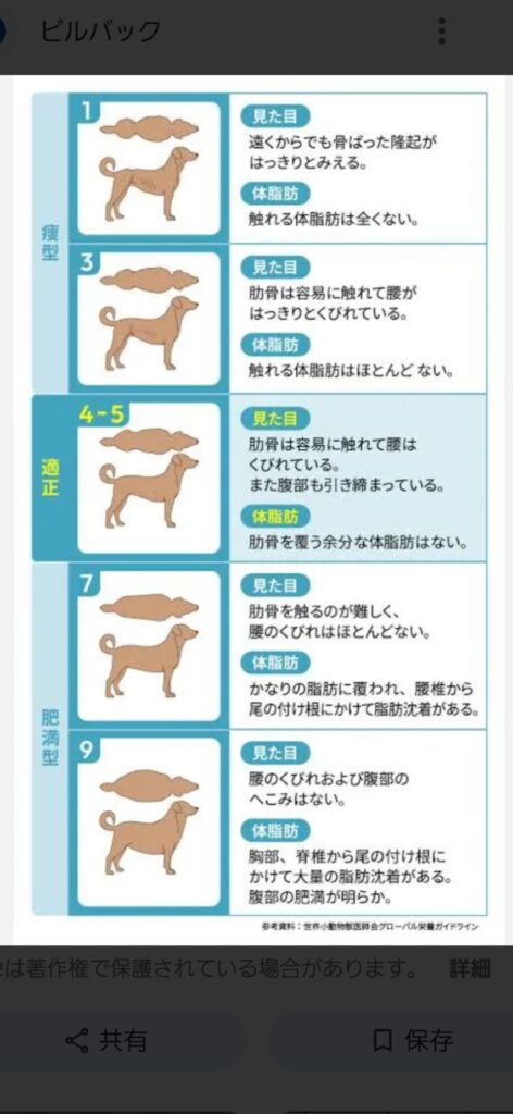 この指標を参考にすると、まりんのくびれはかろうじてあり、肋骨もかろうじて触れるので、5と7の間くらい? 多分、甘々に見てると思うけど、軽~い肥満?